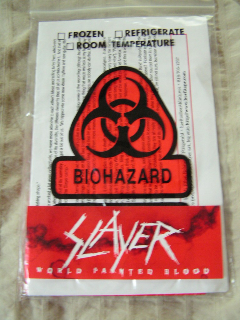 This is a promotional item ala Slayer’s World Painted Blood. The CD and bio are sealed inside a real biohazard bag. We’ve all seen this around. BUt the seller claims that it is “super-rare and never publicly available.” Also: “As this is a promotional advance, the CD may not play in all audio players.”